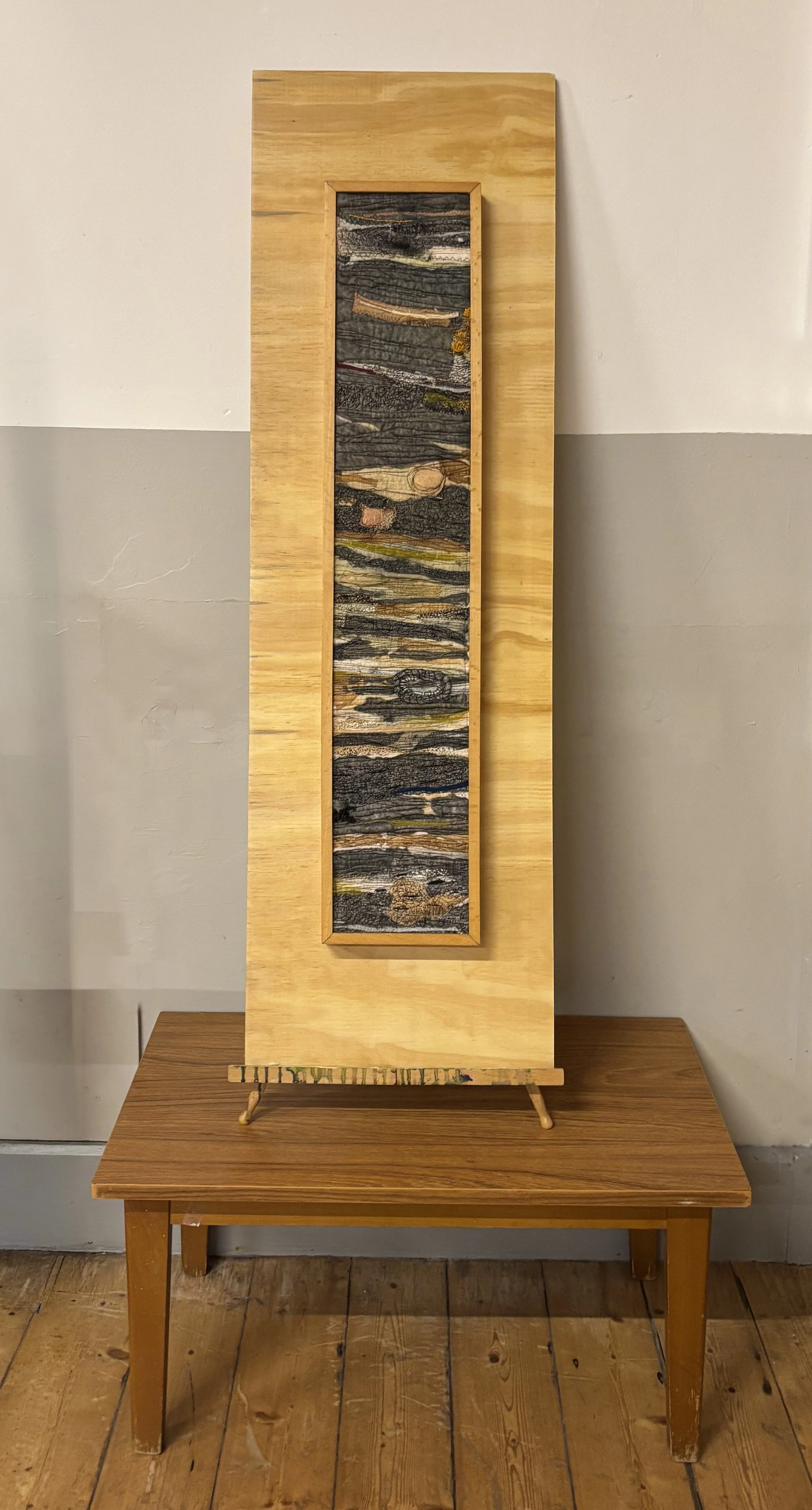fabric, wool, thread, used tea bag fabric, ink, water colour, wooden frame, 2026