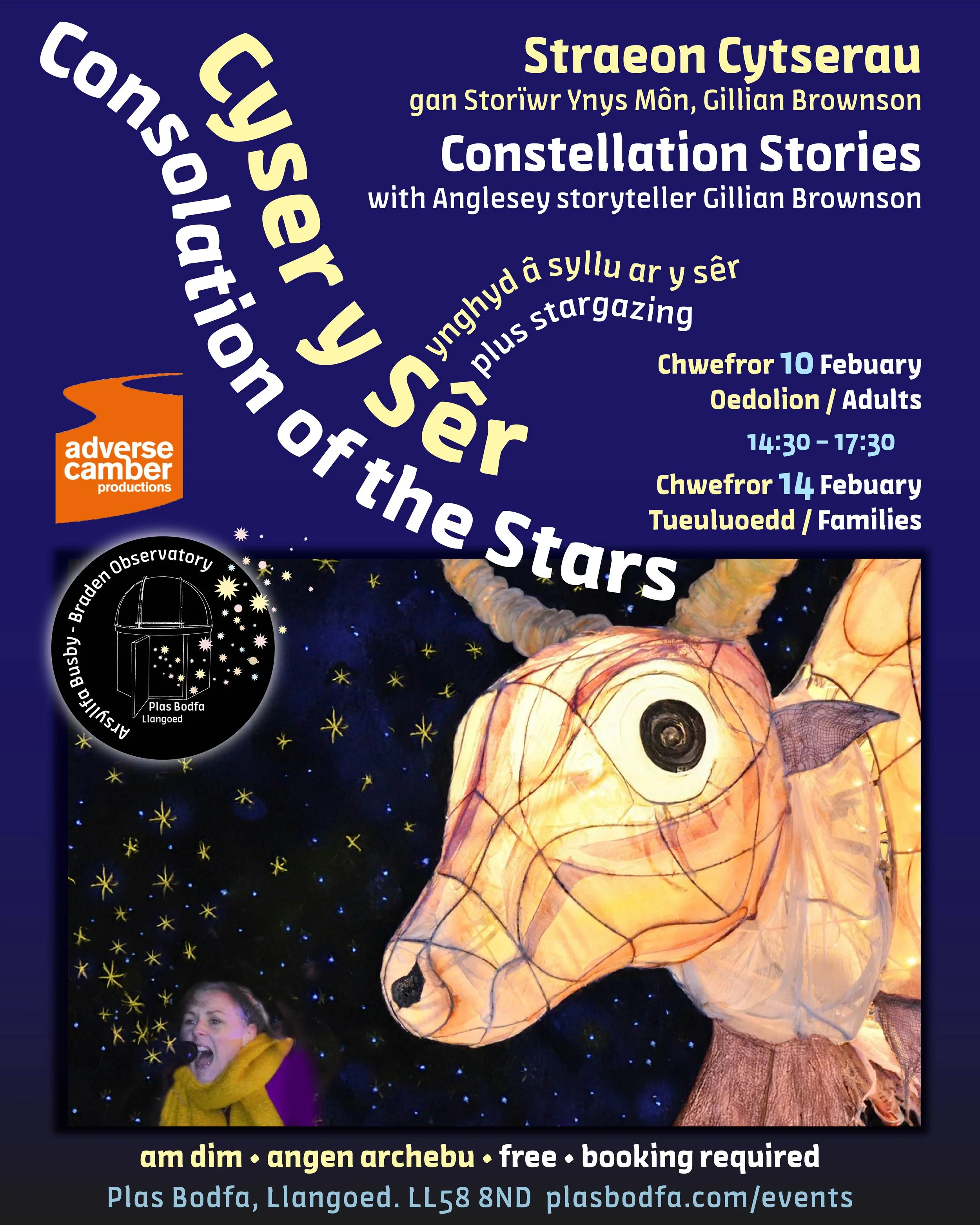To kick off Welsh Dark Skies Week, join Angelsey Storyteller, Gillian Brownson at Plas Bodfa’s ‘Busby Braden Observatory’, for an afternoon of constellation stories before an early evening gaze up at the stars – where the characters from the stories may well come alive in starlight.