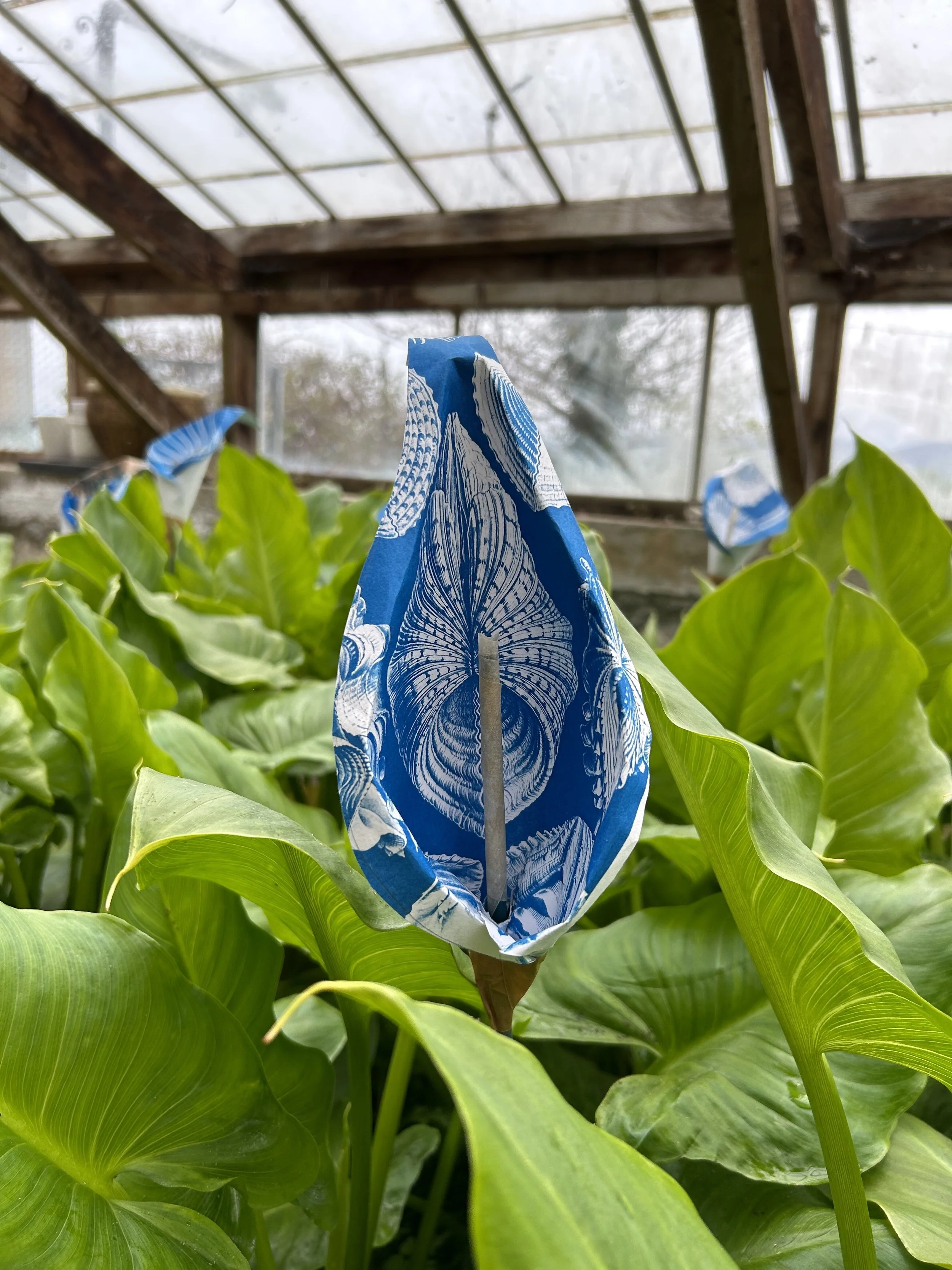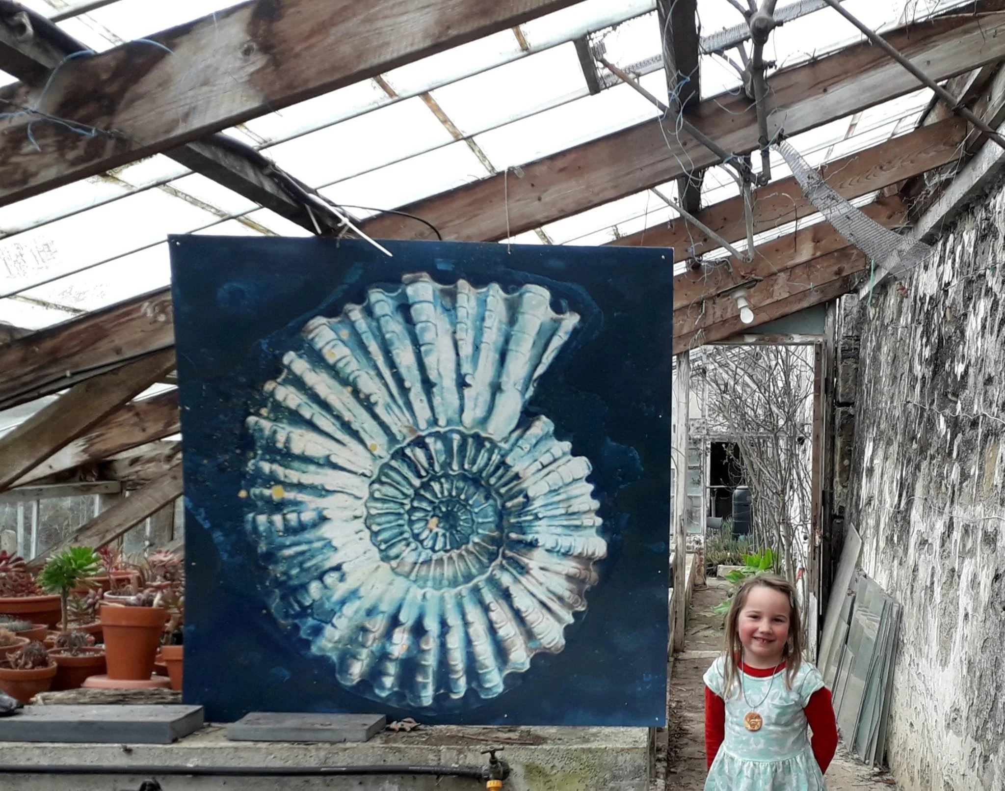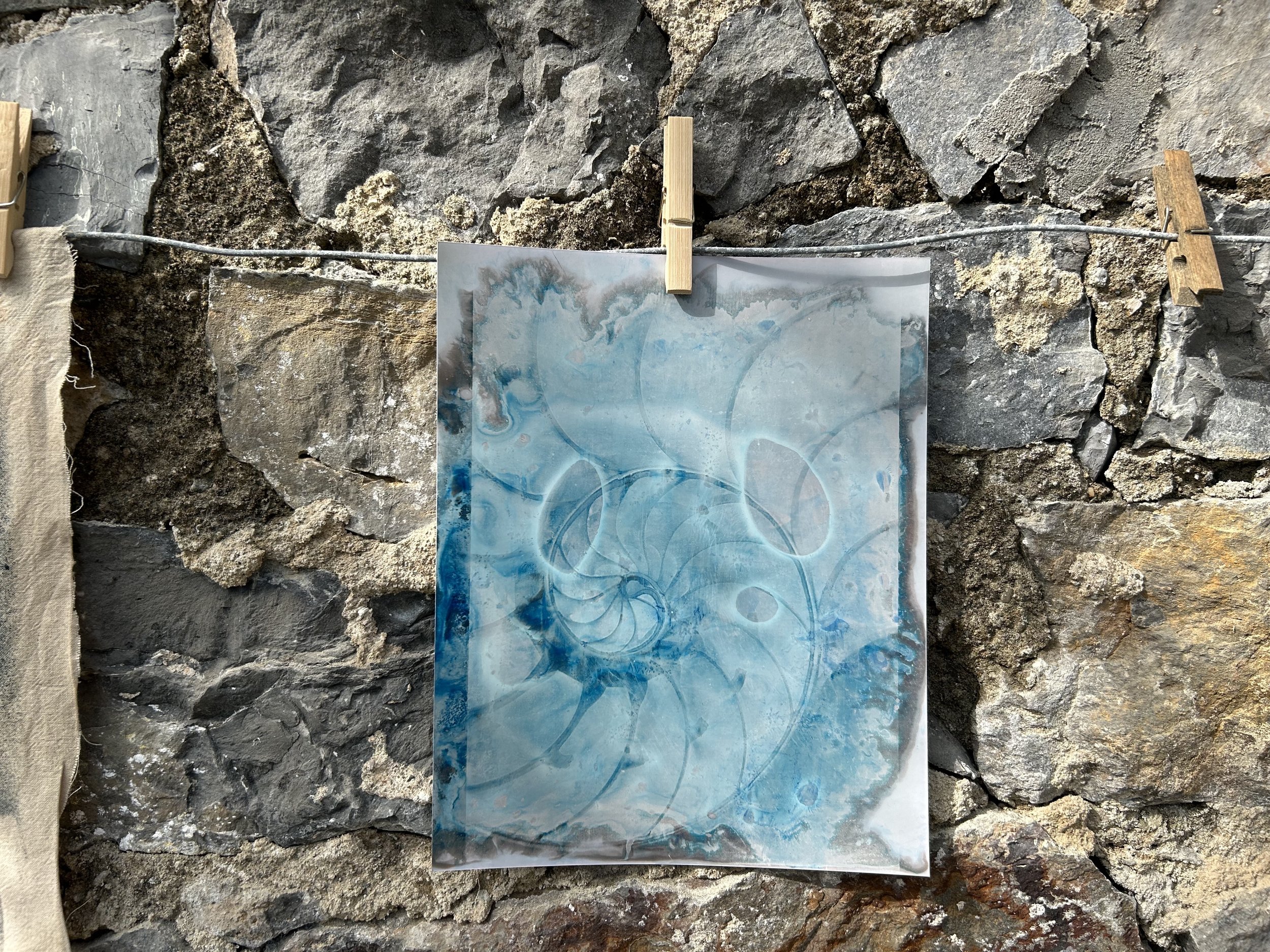 A special edition of the cyanolillies inspired by the limestone explorations of Mari Rose and Julie. The images are ammonites, a fossil often found in limestone.