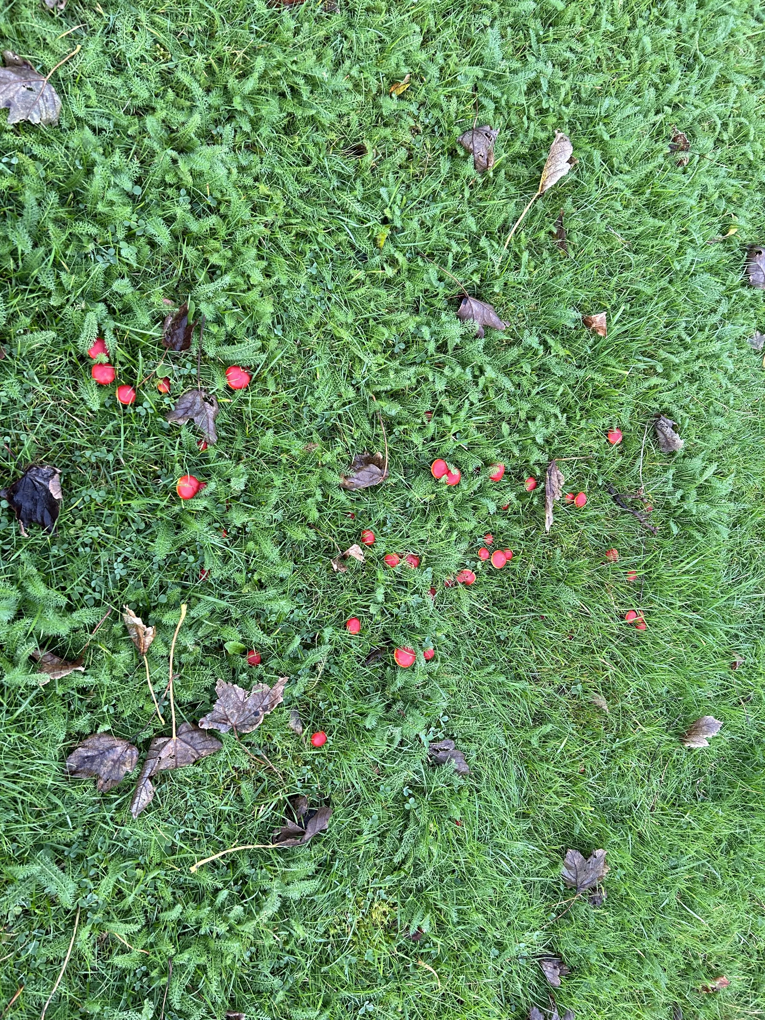 We continue to be amazed with the spectacular display of fruiting fungi in our north garden, a spectrum of colours and forms popping up in circular formations and tightly formed clumps. We are fortunate to have annual visits from the mycologist Charles Aron and Debbie Evans, who have included our grassland as part of a wider fungus survey project on Anglesey and throughout North West Wales.