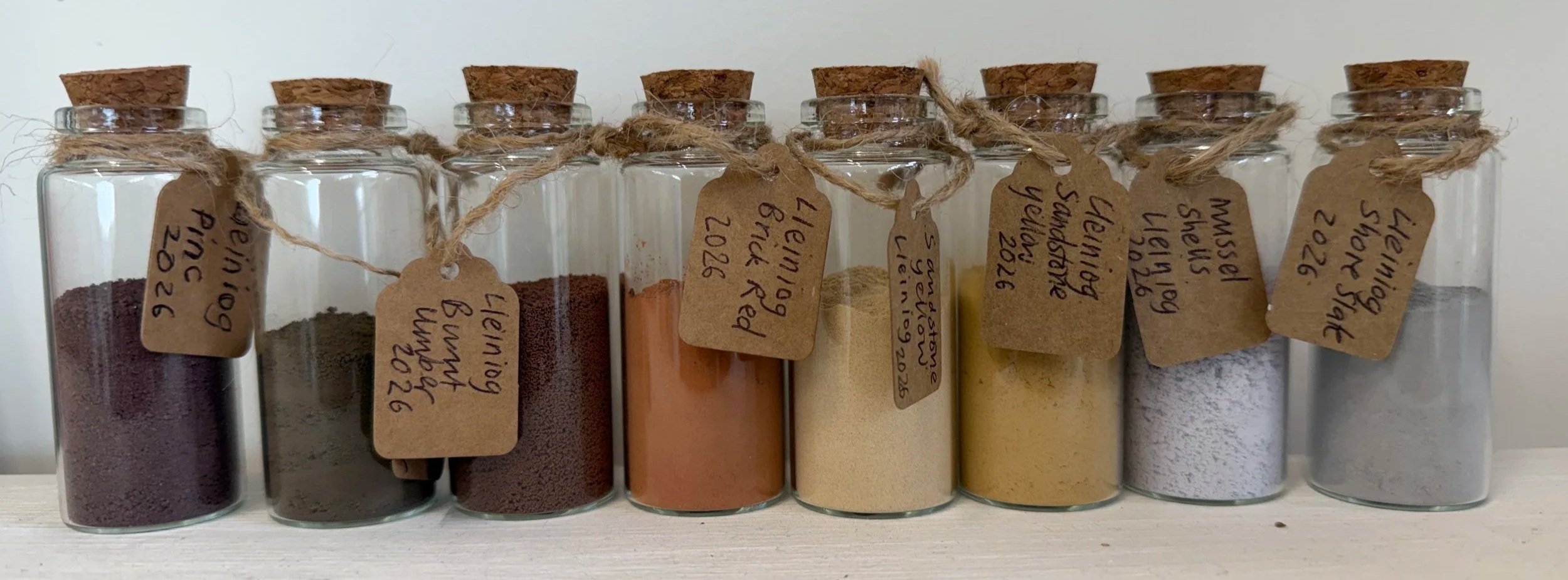 She has begun processing some of the material that she has foraged so far. The long meditative process of soaking, pulverising and grinding the sentiments into smooth, rich pigments. The Lleiniog pigment collection is well under way!