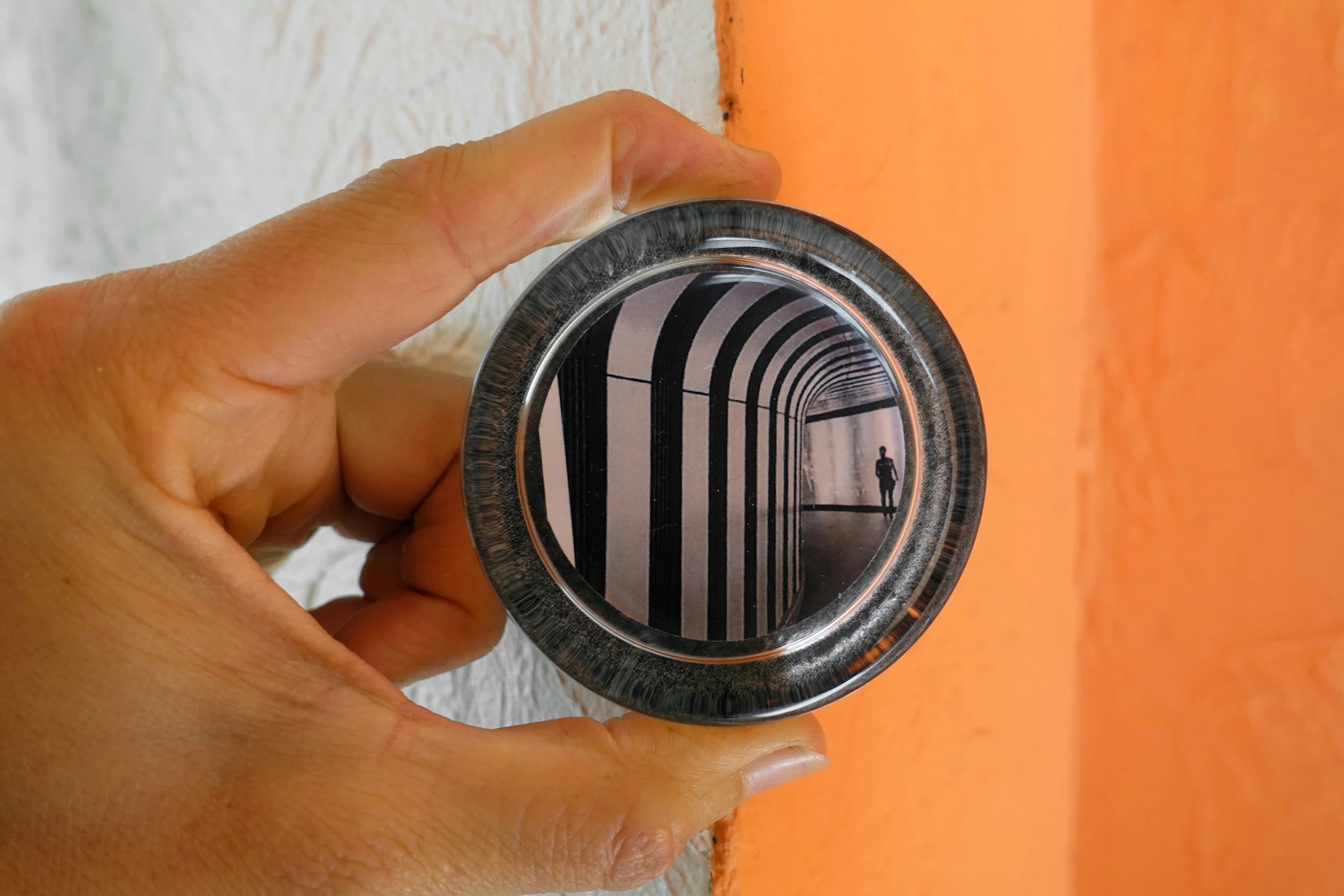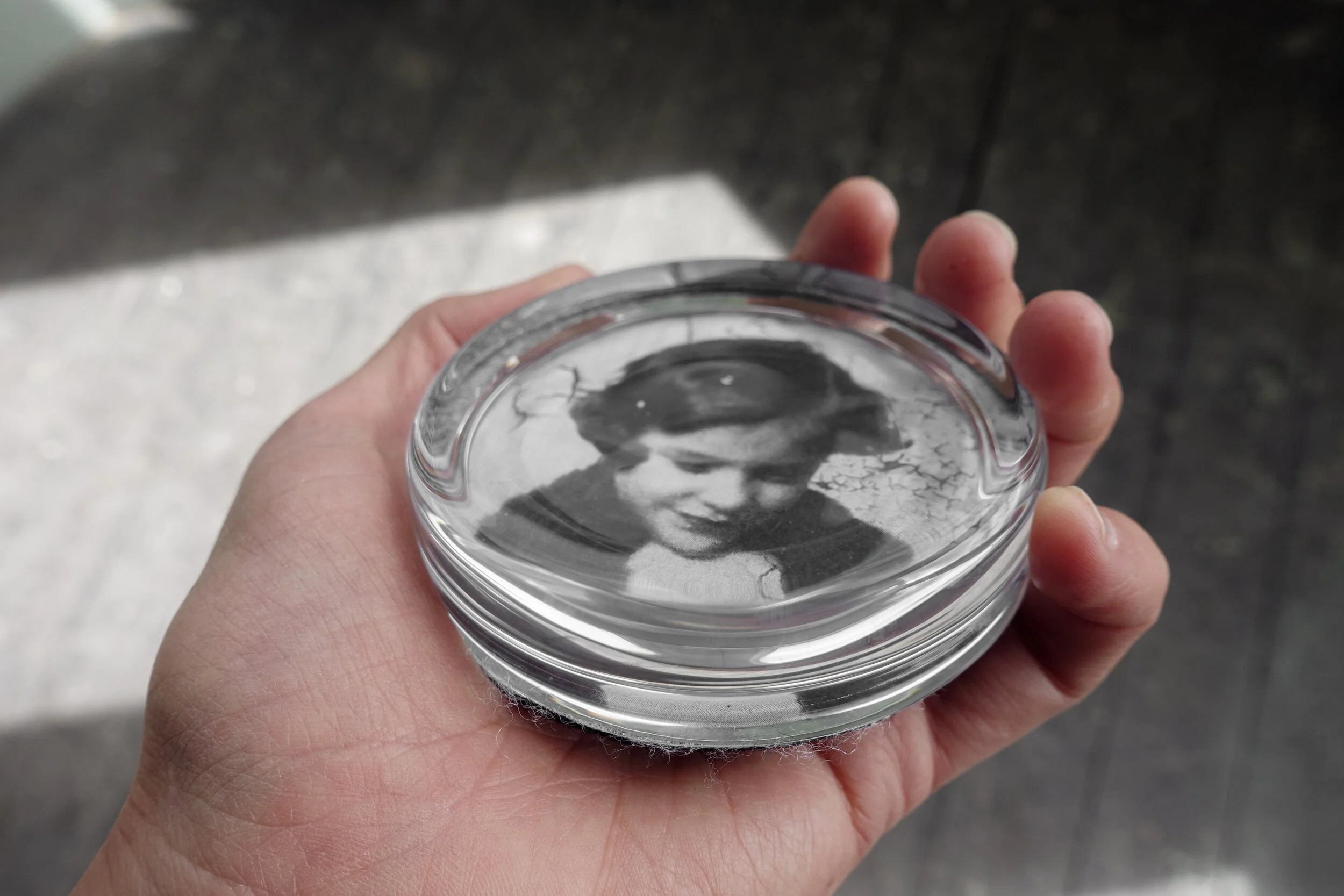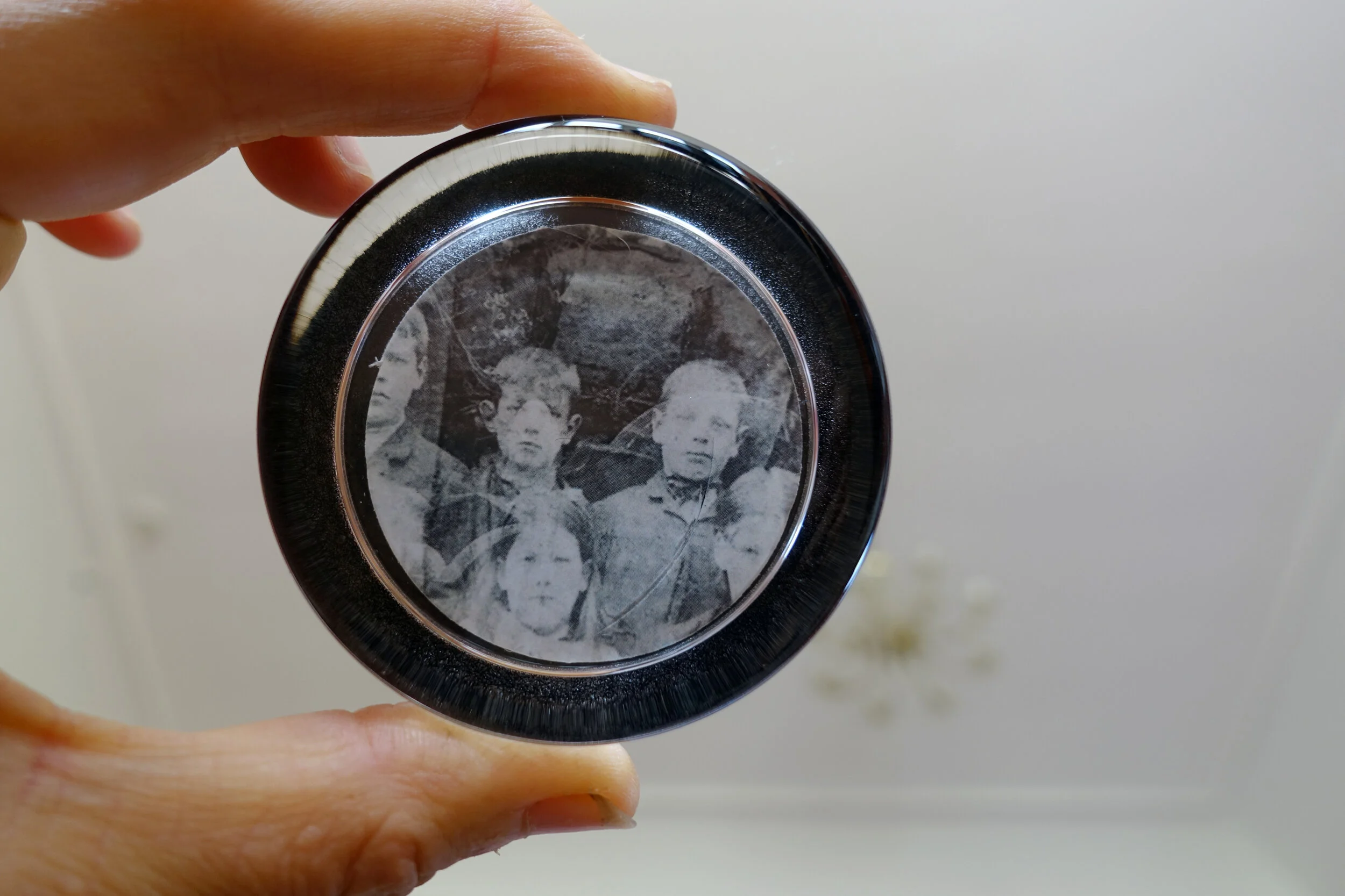 large round glass paperweight, black and white vintage photograph, velvet backing - 2020