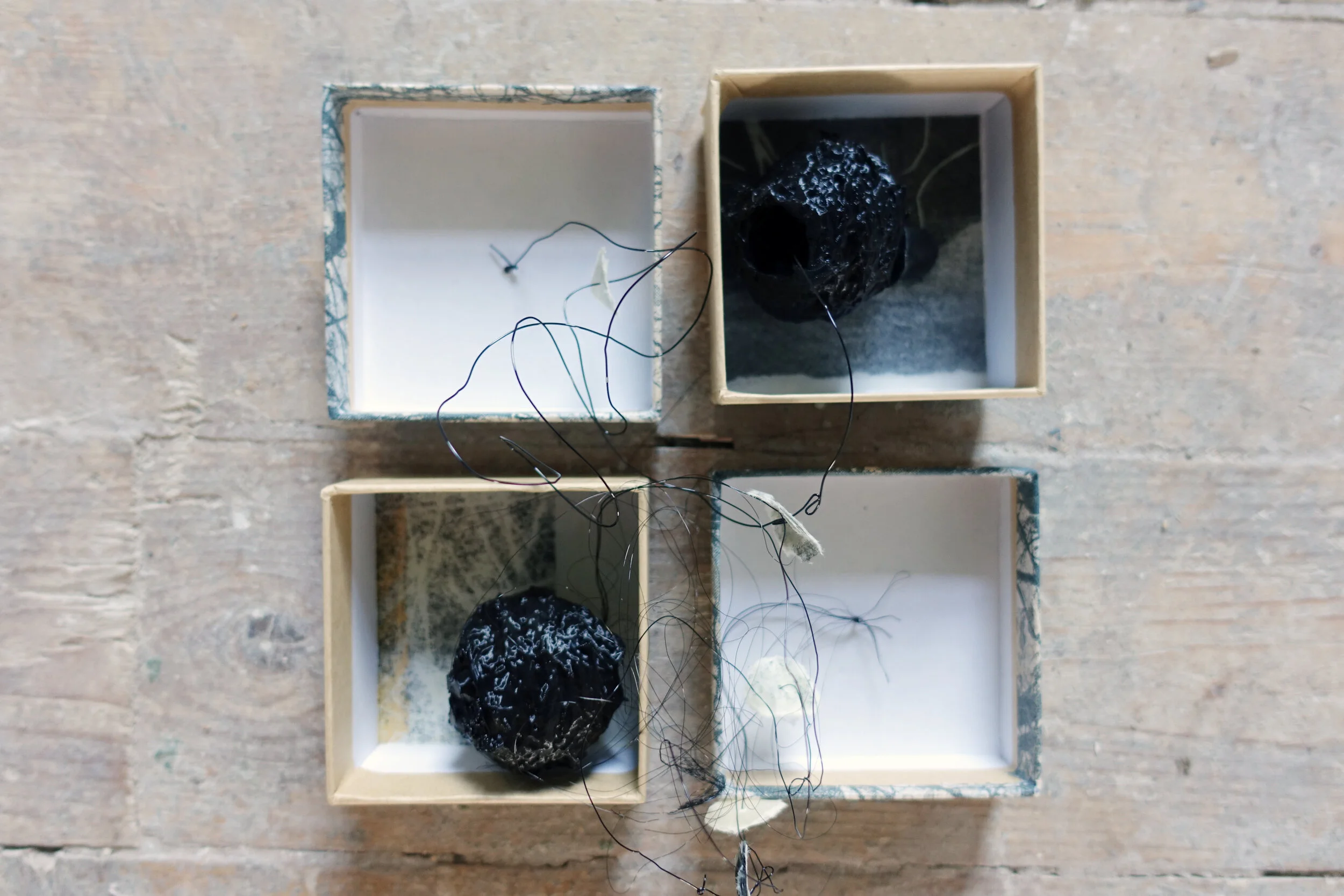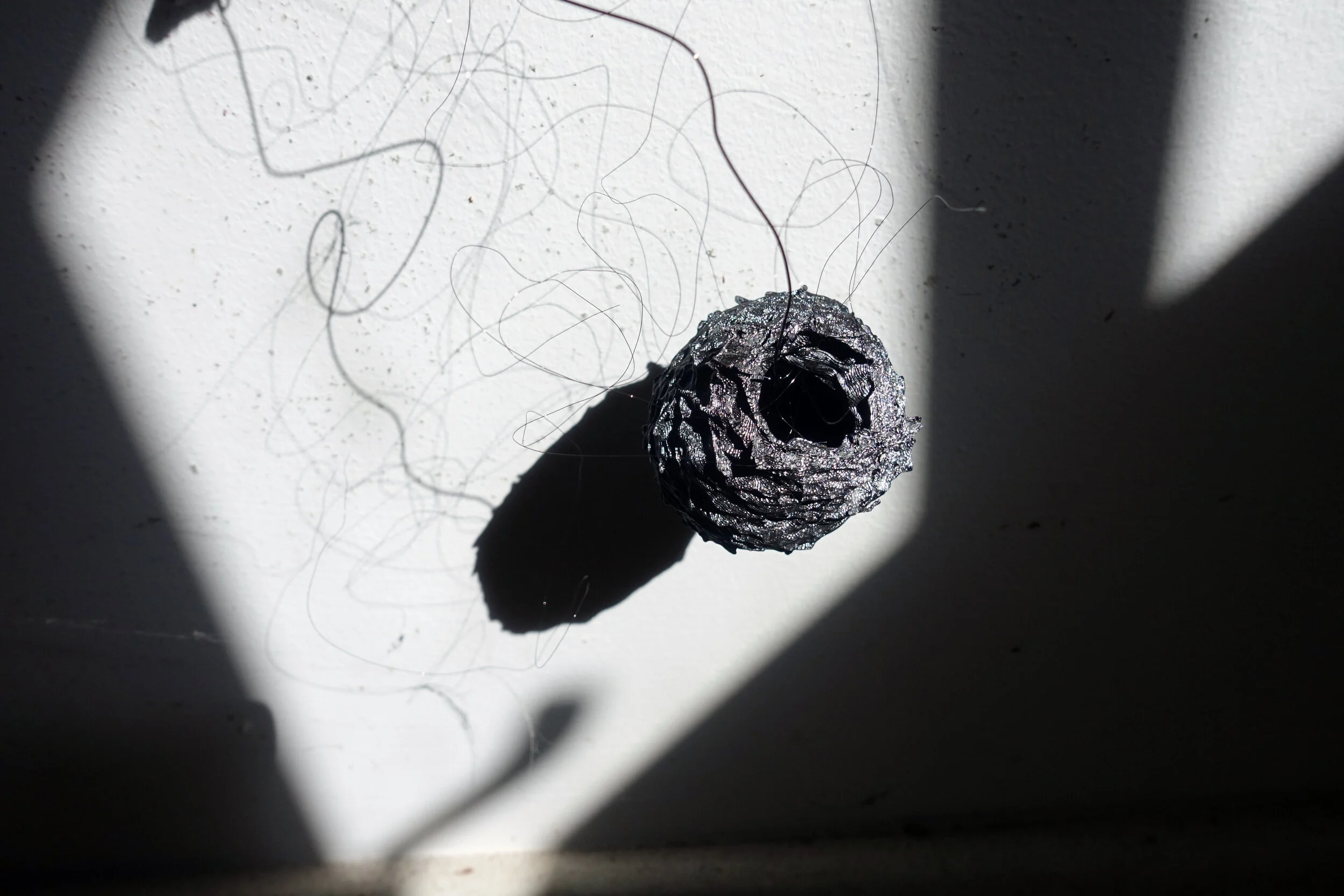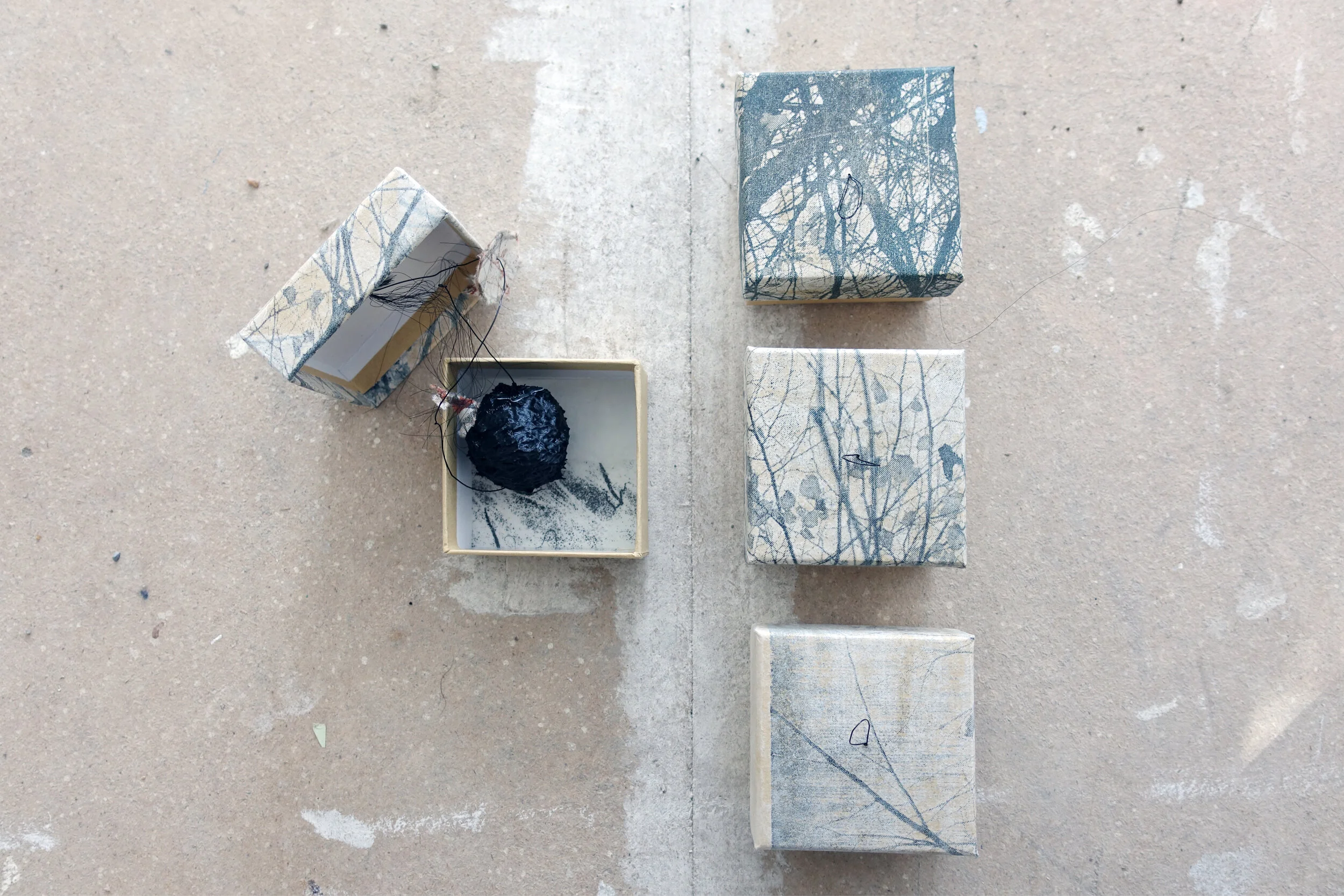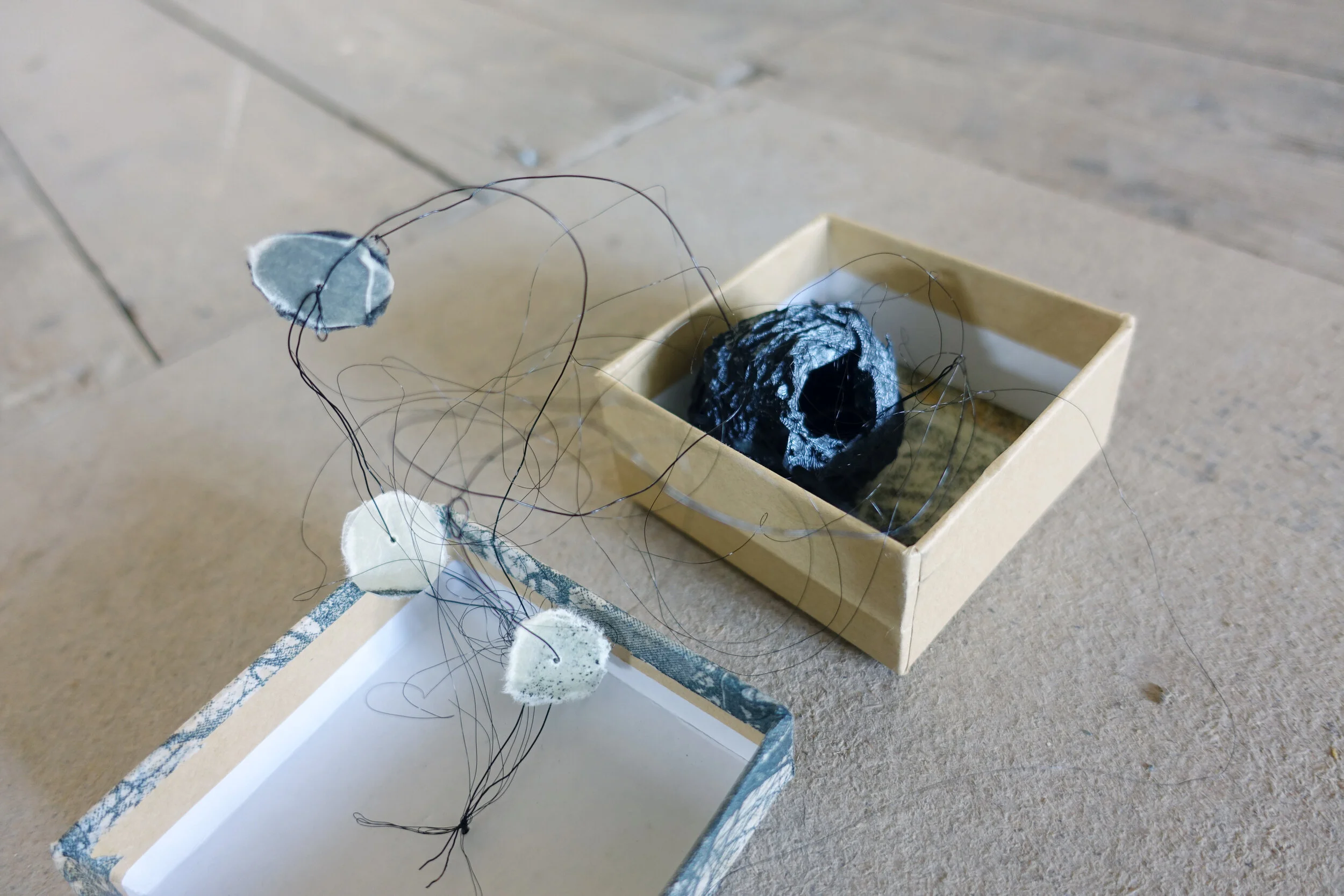 hand printed relief print on paper, 3d print using PLA (a vegetable material), wire, card