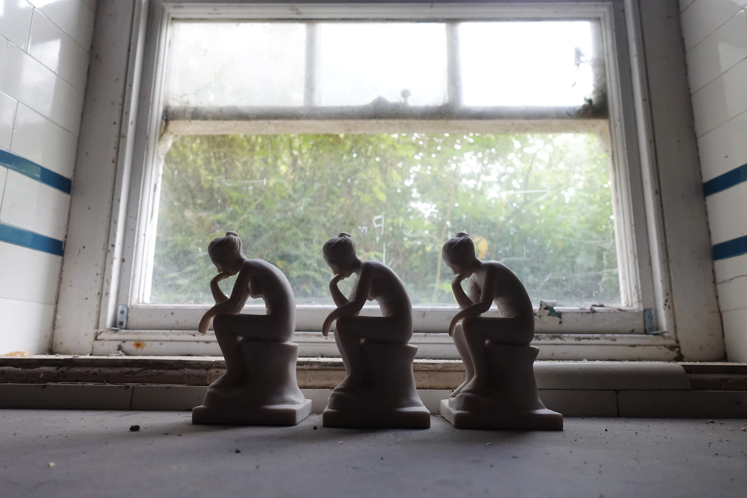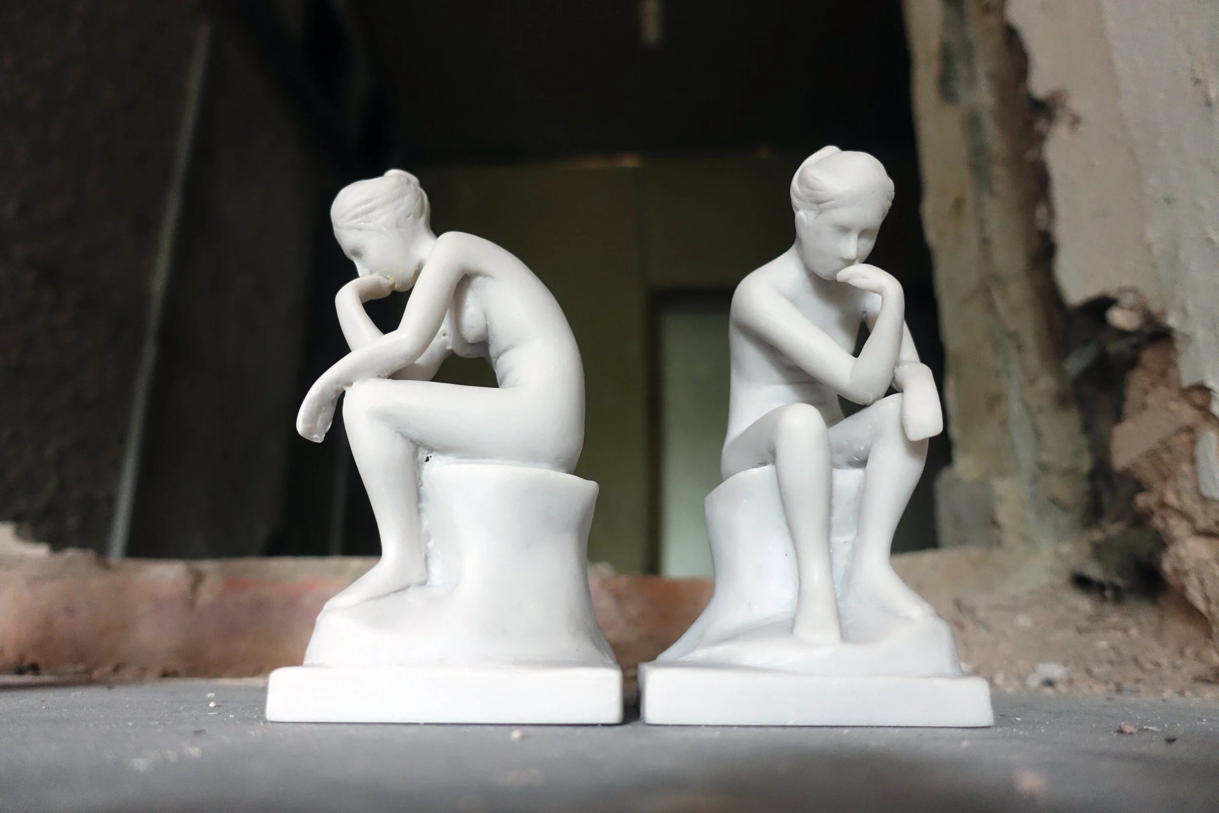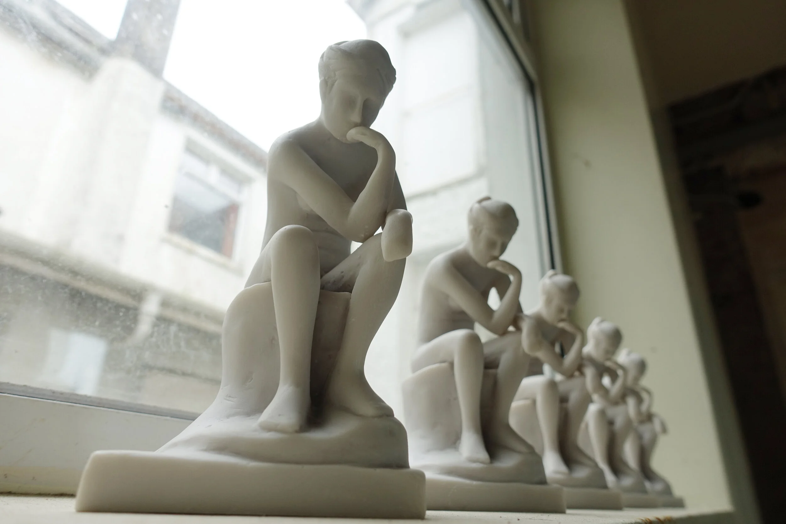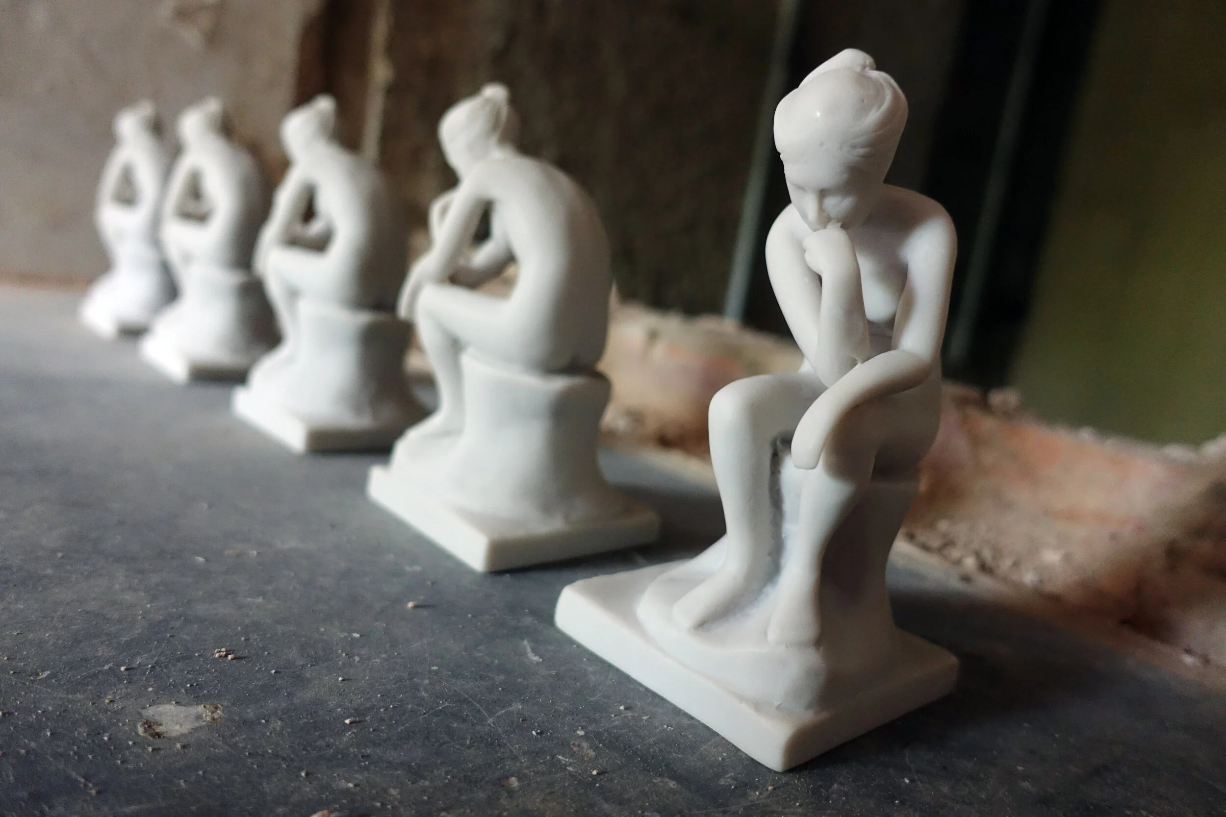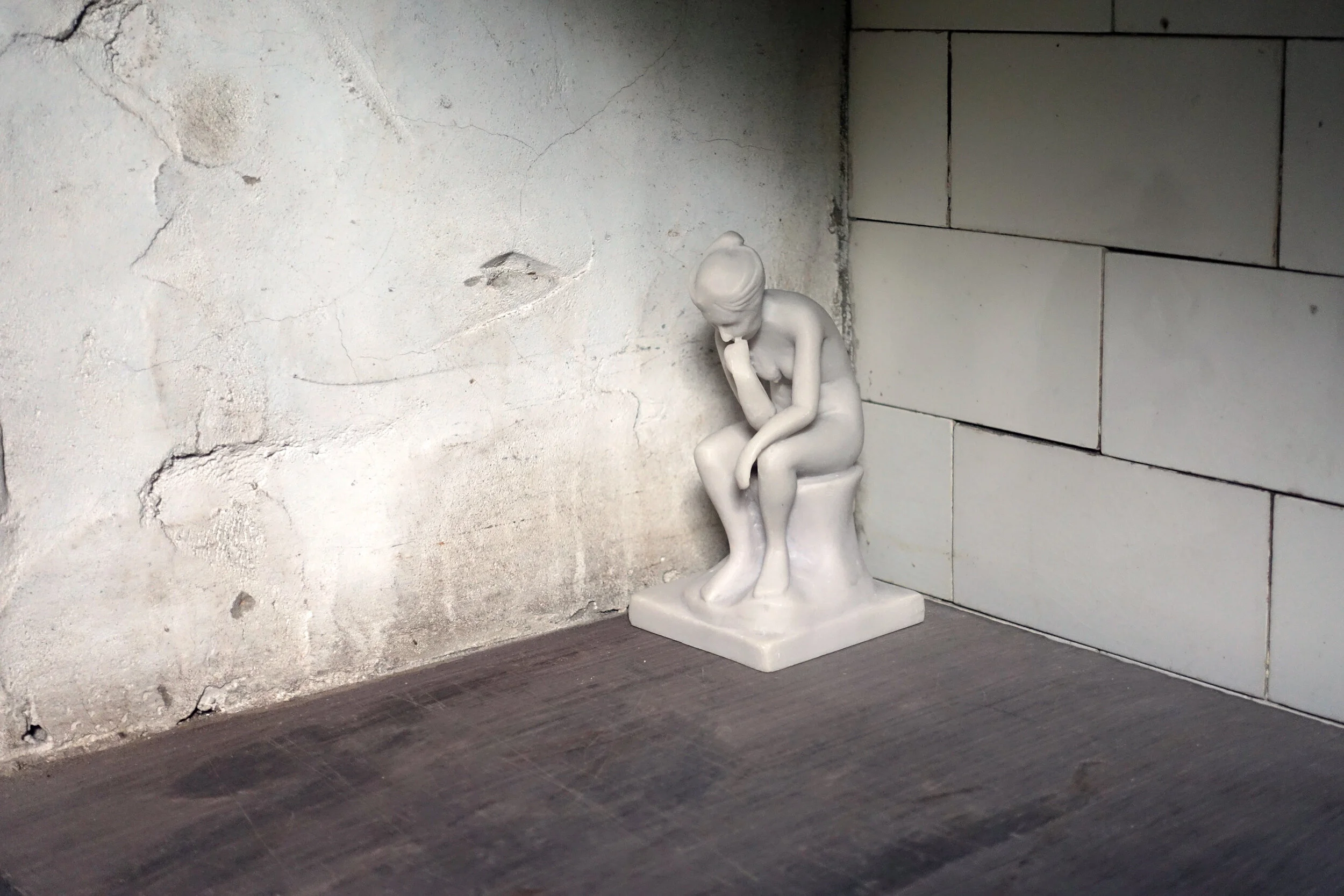 Rodin‘s “The Thinker” is transformed into woman form; anonymous and ordinary. She could be a wife, a mother, a single person, a worker or a housewife; I really don’t know what she is thinking…