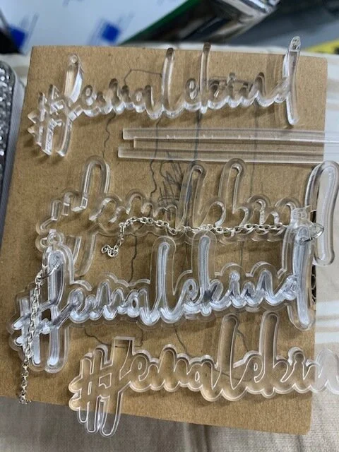 Trying to find someone with a laser cutter available in the middle of lockdown that I could get to for a socially distanced meeting was interesting! I needed to add an extra layer around the original perspex word as it was too fragile to post out. It was quite a feat but I ended up finding one up the road from me with someone who had taken delivery of a new machine at the beginning of lockdown. He was using the time stuck home to learn something new which helped me out no end. Luckily he had some sheets of clear perspex available too as it was really hard to get hold of any as everyone was buying it up for their business & staff for when they reopened. I probably couldn’t have chosen a worse product to try & make my multiples out of at the time!