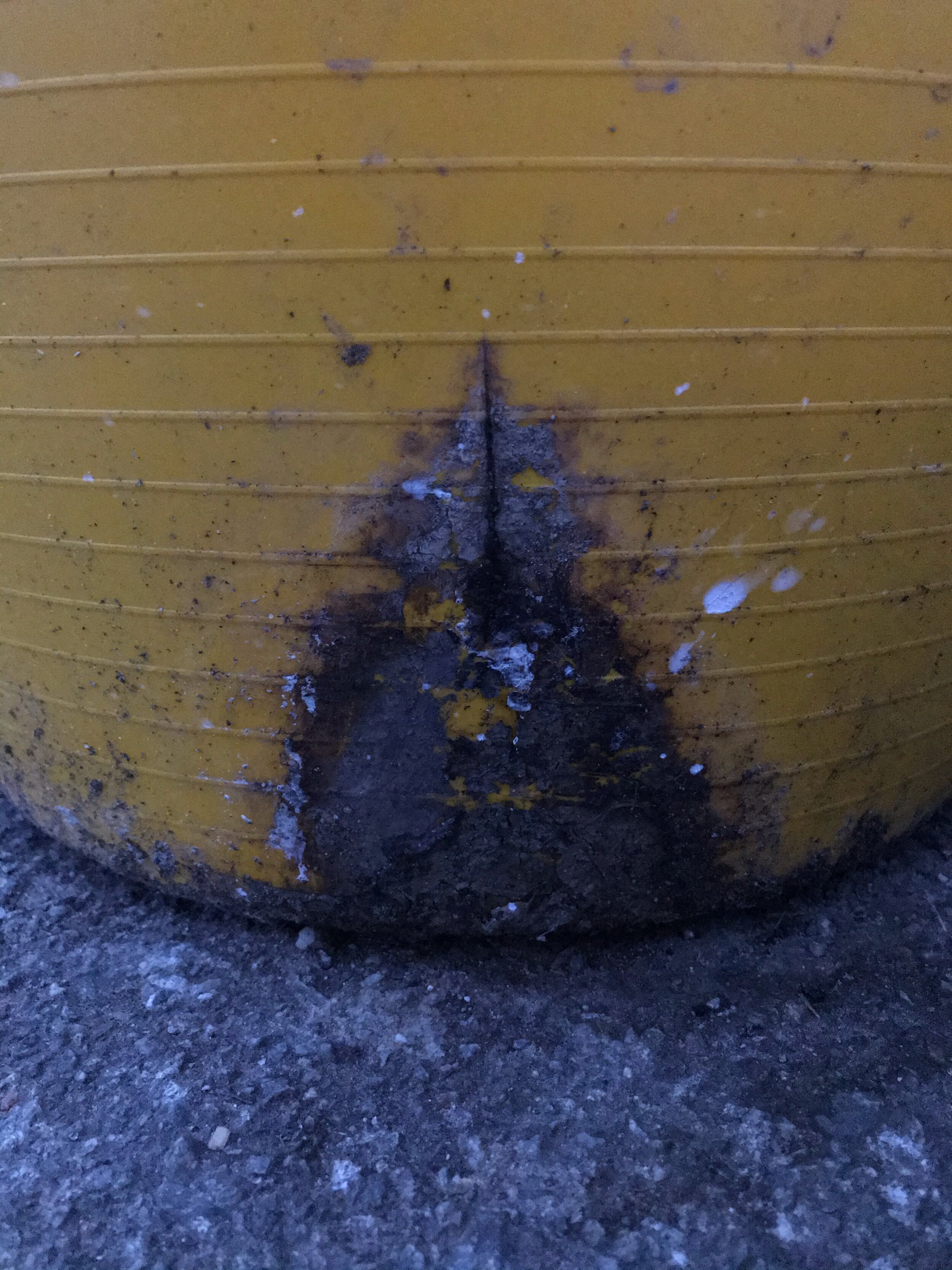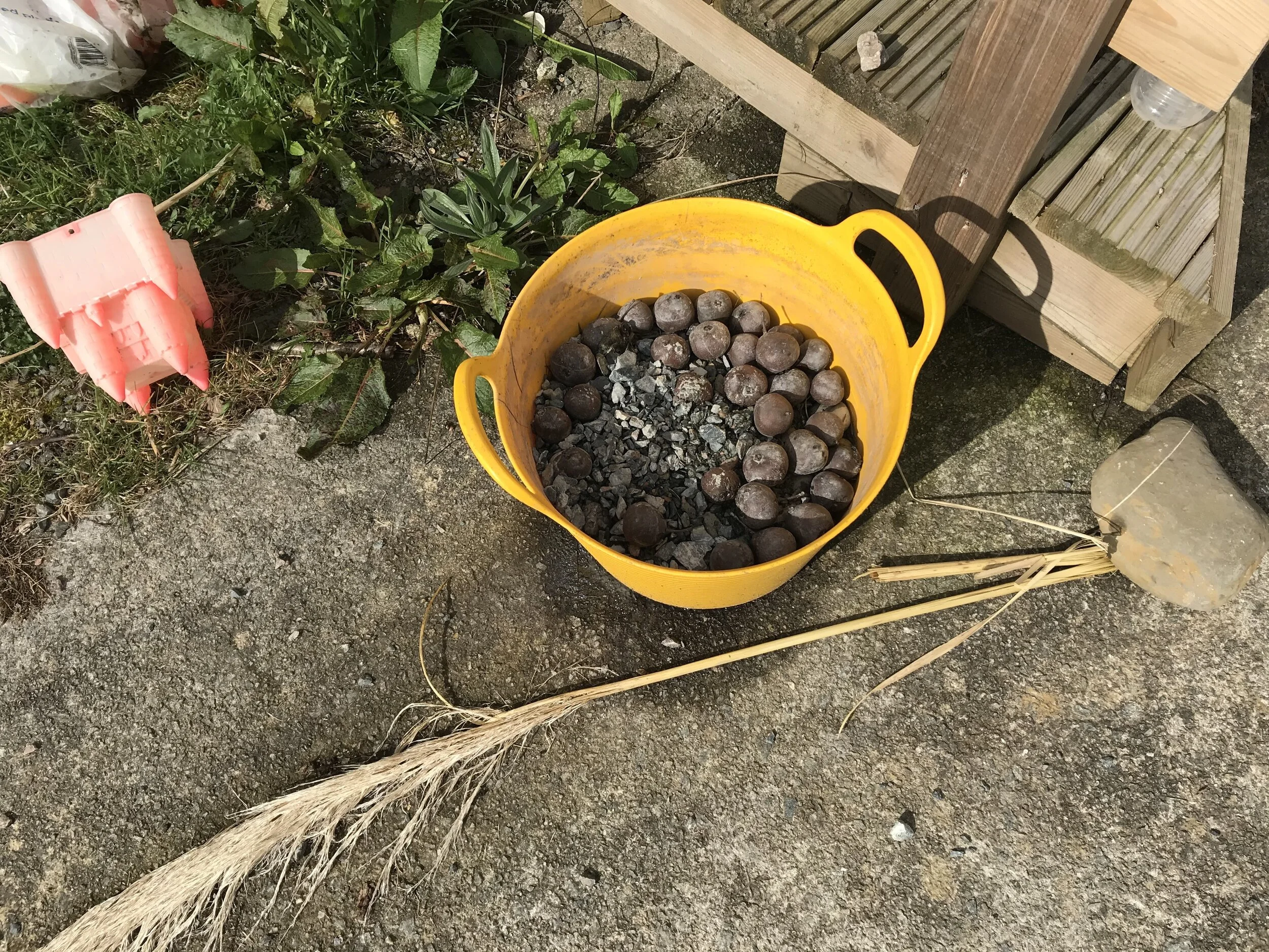 Contents: a yellow plastic bucket filled with small pears, water, oatcake crumbs and sometimes ice, now grass and rocks, draining over time