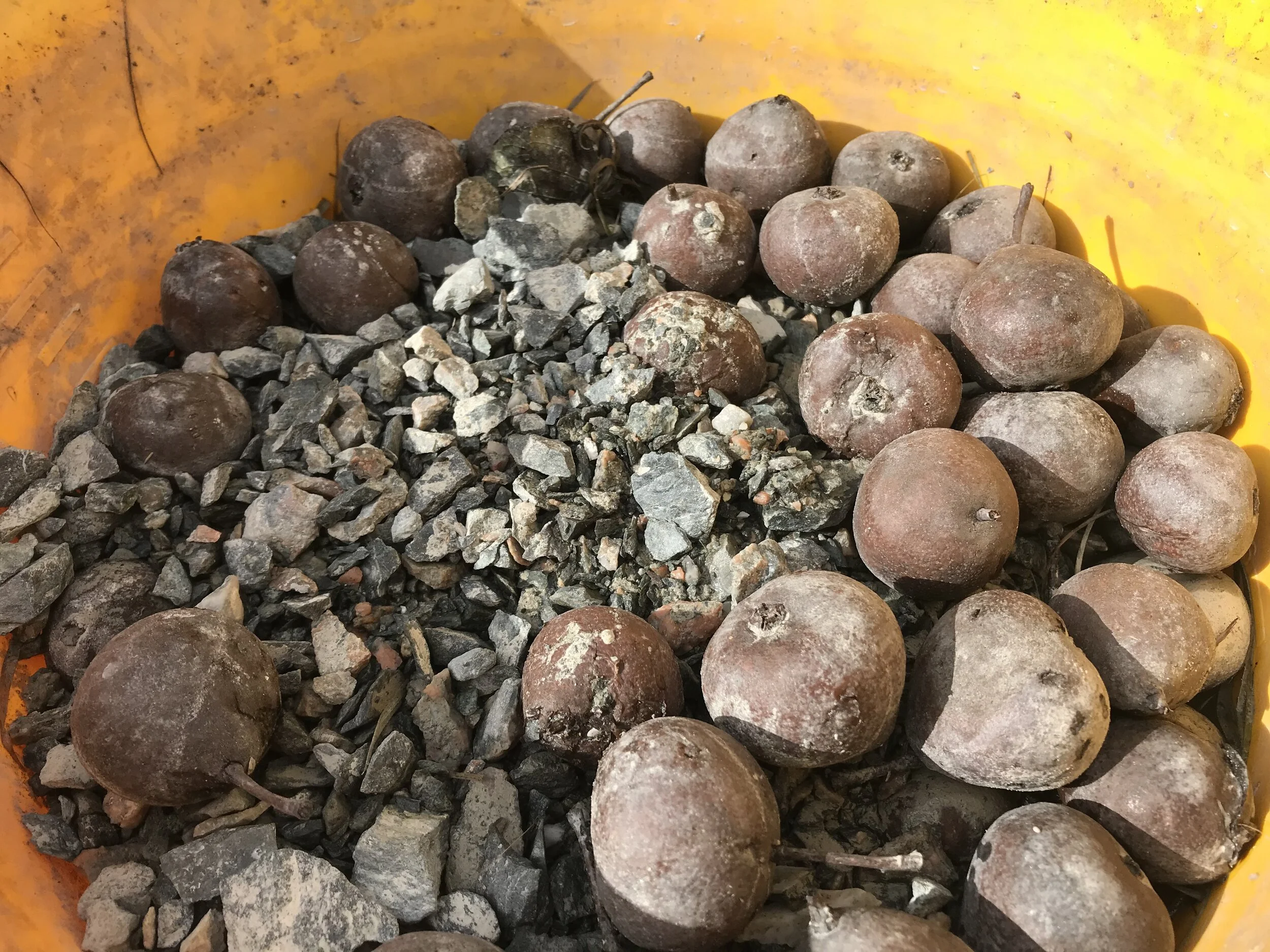 A permanent wet ring surrounds the bucket. I suppose there is a leak? Surprising, as its supposed to be quite robust. There were more rocks in there than I had imagined. Shrivelled. It no longer smells of fermentation.