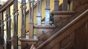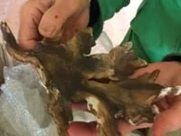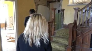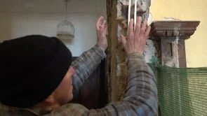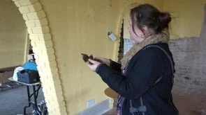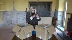 Two boxes of ceramic leaves have arrived in Plas Bodfa. The creator, Annie Horsley, places the first of the 54 leaves in an upper room of the house.
